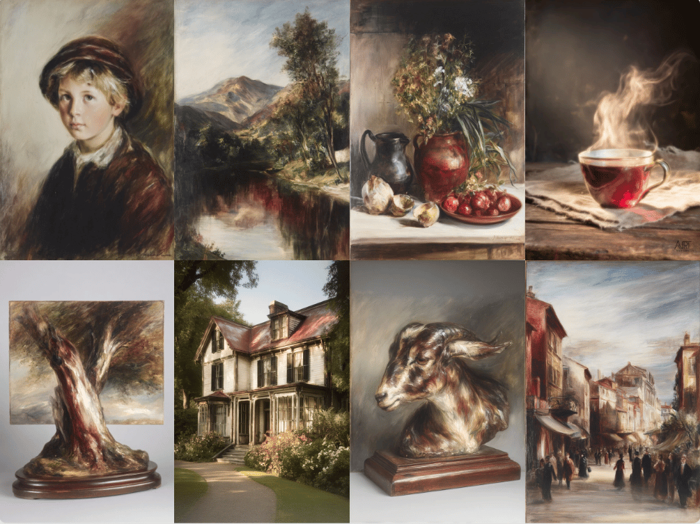 Rich oil painting style with visible brushstrokes and traditional lighting. A museum-quality look with deep colors, dramatic shadows, painterly texture. This one is very fun to experiment with!