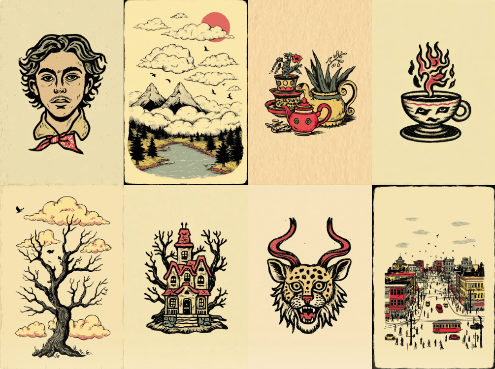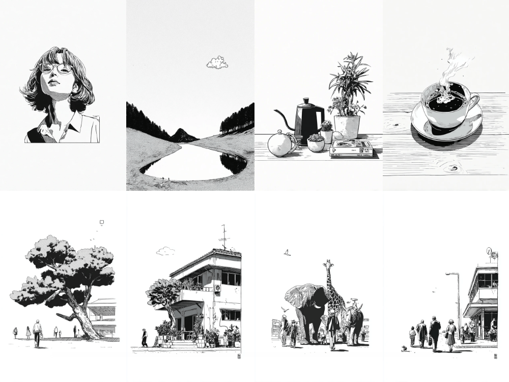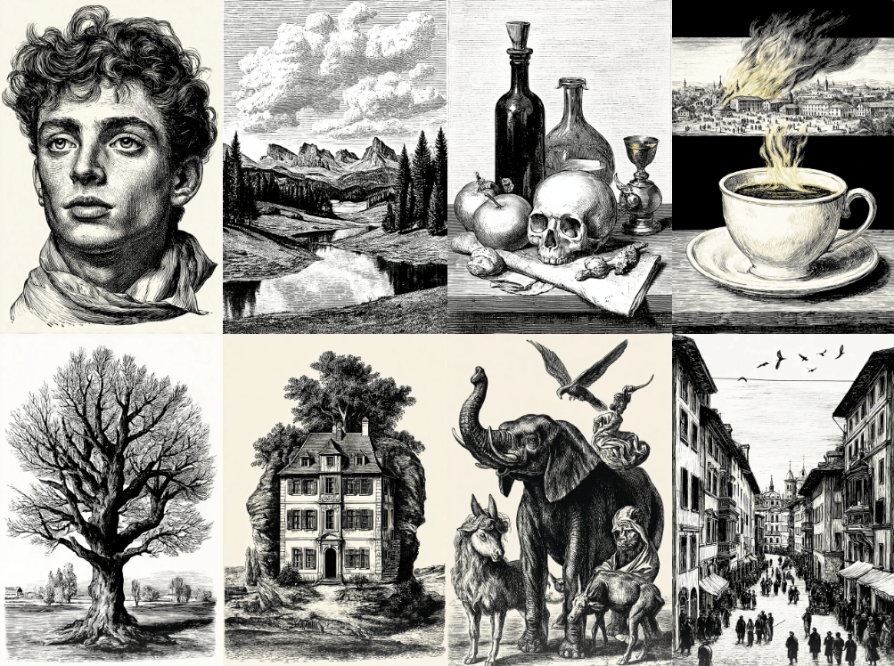 This style produces clean, high-contrast black and white illustrations with a hand-drawn quality. Great for editorial illustrations you'd find in literary magazines or thoughtful brand campaigns. This one works especially well for portraits, still life compositions, and architectural scenes.