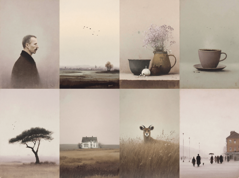 Soft, muted realism with gentle lighting and earth tones. The colors stay in grays, tans, and subtle greens. Everything feels quiet and understated. Outputs look like moody still life photography.