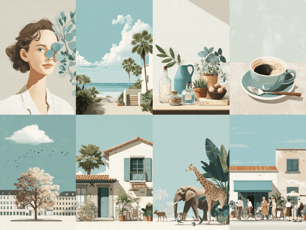 Soft watercolor style with creams, blues, and terracotta tones. Very sun-drenched and coastal. Palm trees, pastel buildings, warm light. The overall vibe is relaxed and breezy, like vacation postcards or travel illustrations.