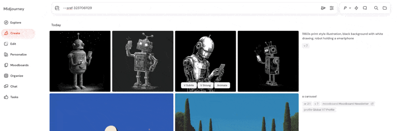 Style reference codes (the “--sref” parameter) tell Midjourney to apply a specific aesthetic or artistic style to your generation. A lot of Midjourney creators will share out their favorites, but you can find popular style codes by checking out the "Explore" page in the Midjourney web app.