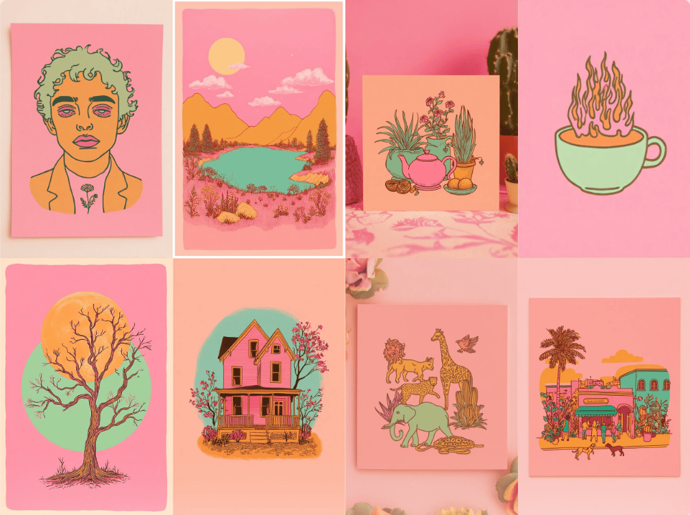 Vibrant, flat illustration style with bold outlines and a cheerful color palette dominated by pinks, oranges, teals, and greens. The aesthetic is playful and graphic, like modern greeting cards. Everything has a handmade, crafted quality.