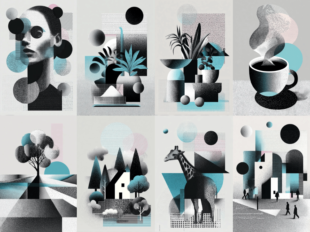 Layered geometric shapes with halftone textures and a color palette of blacks, teals, and soft pinks. Cutout circles, textured gradients, and overlapping forms that give everything an analog, printed feel. The style has that modern editorial look.