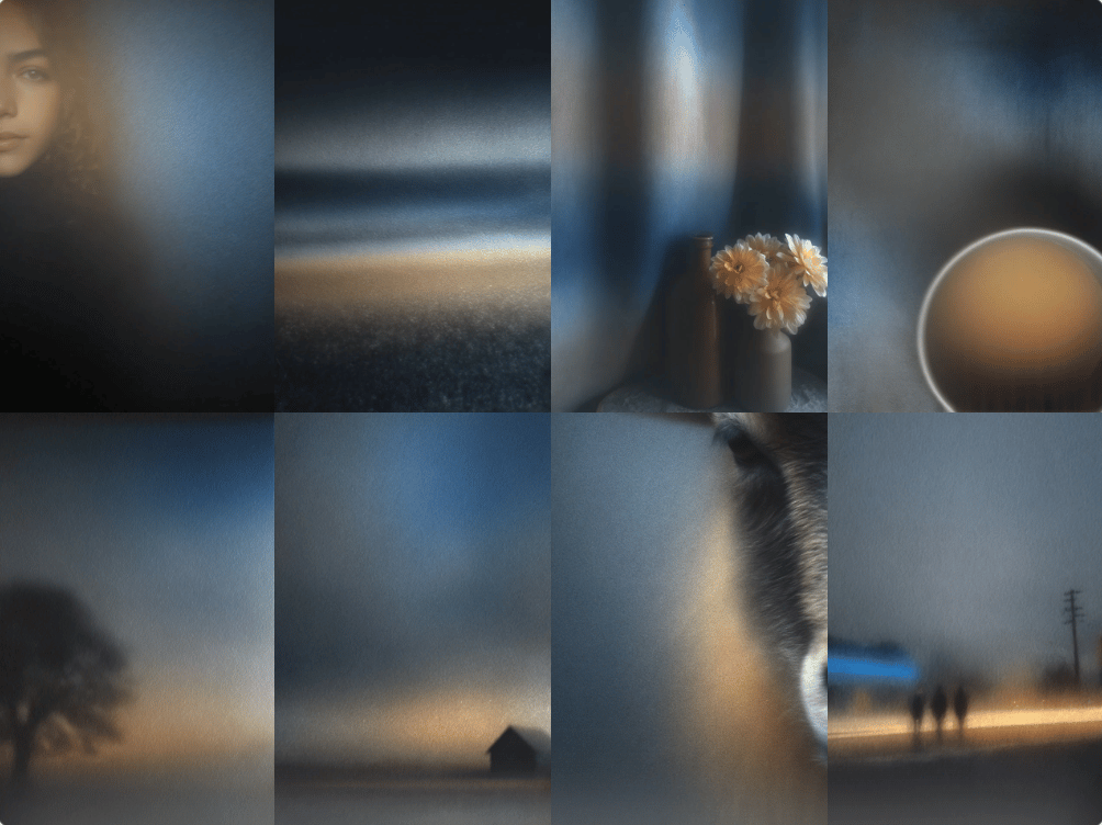 Moody, out-of-focus shots with lots of blur and soft lighting. The colors are muted with warm glows breaking through darker areas. Very dreamlike and atmospheric.