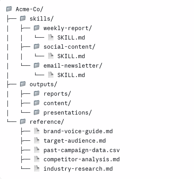 It can obviously get a lot more creative/complicated than this, but this is a pretty efficient, navigable structure for Cowork to use.